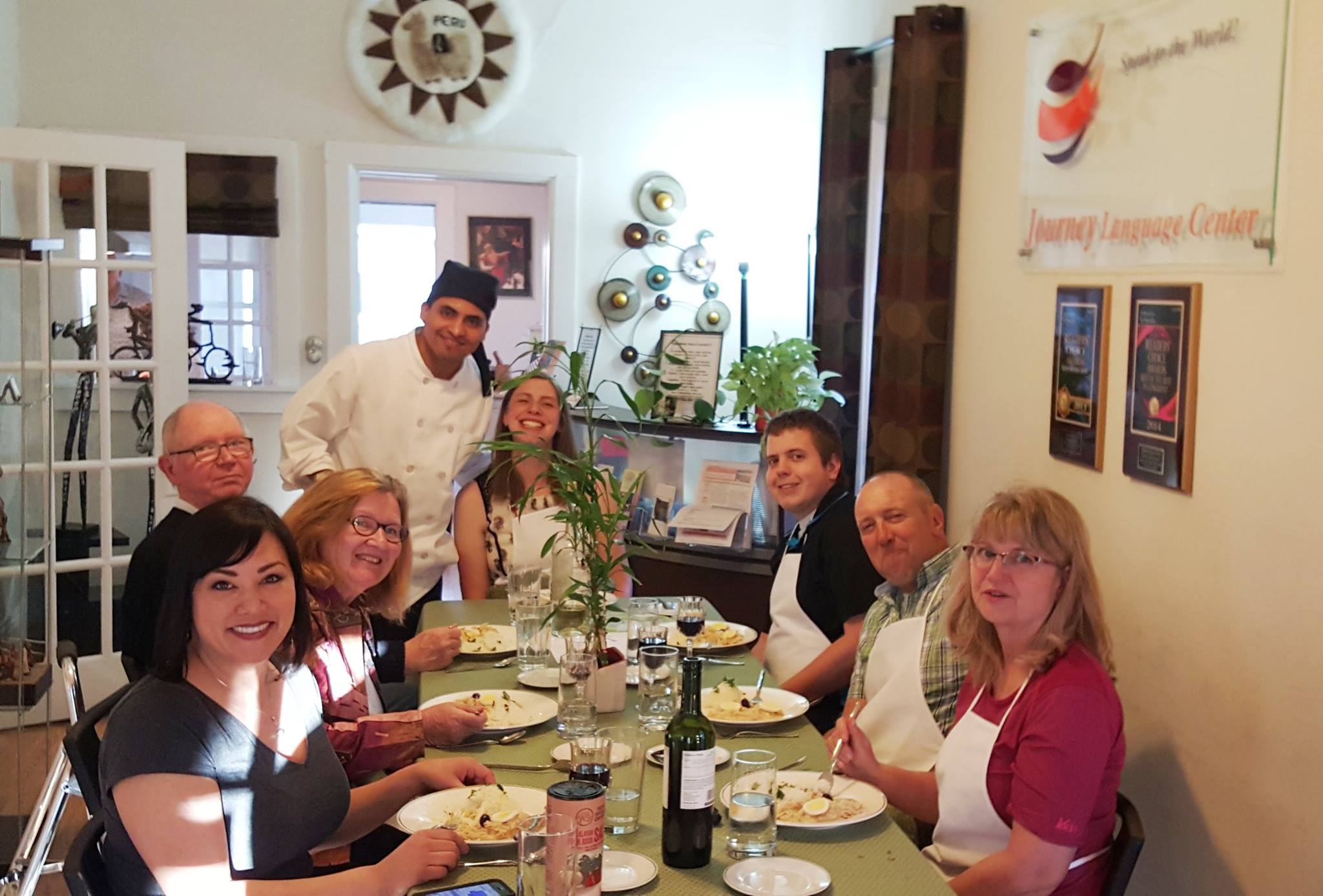 “I participated in Journey Language Center’s cultural and cooking event and had such a fun afternoon! Students of all different levels listened to music, drank wine, and helped to prepare a delicious meal of Spanish and Peruvian dishes. While we sampled cheese and ham, the chef and teachers gave us some background information pertaining to the food we were going to prepare. Then we headed to the kitchen to cook, using high-quality, mostly organic ingredients. When everything was ready, we sat down at a beautifully set table and enjoyed an incredible meal. I left happy and very satisfied, looking forward to signing up for the next cooking event.”